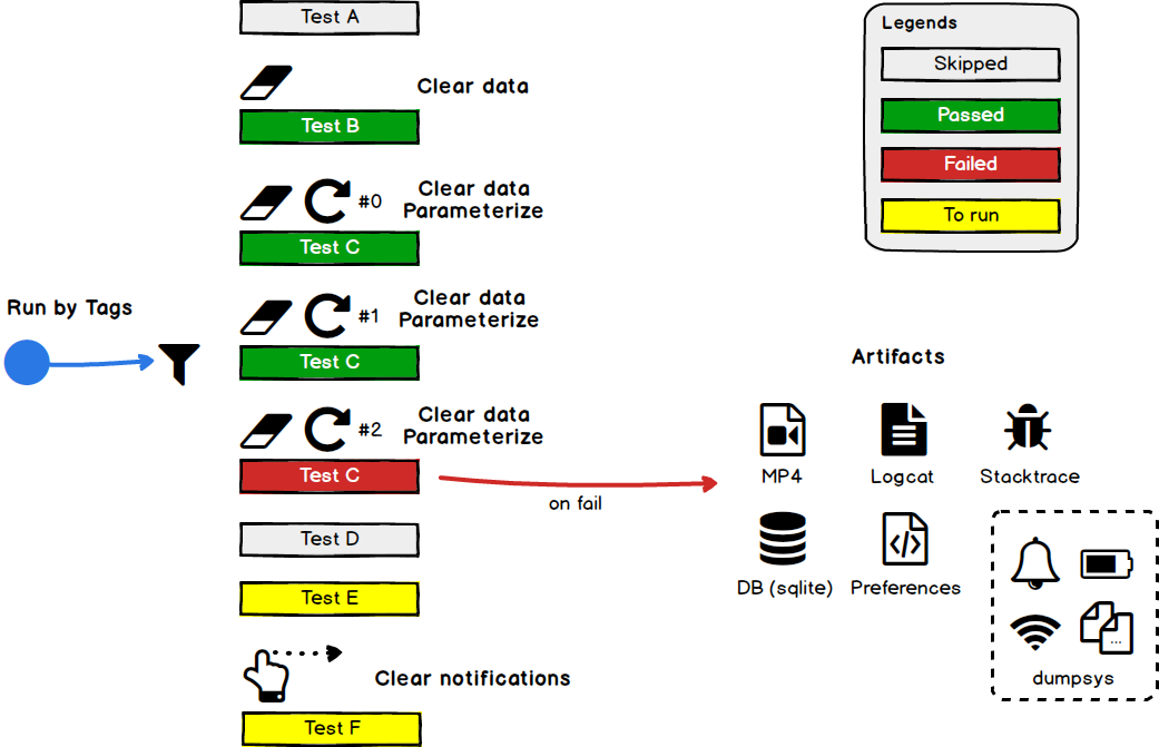 Tests - Part 2 For each test — collect logs, record a video, dump db, preferences and more. Clear data, run by tags and with params. Easy extendable. |
